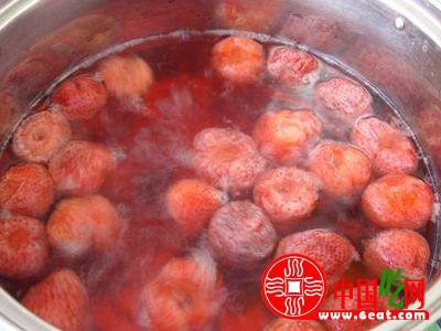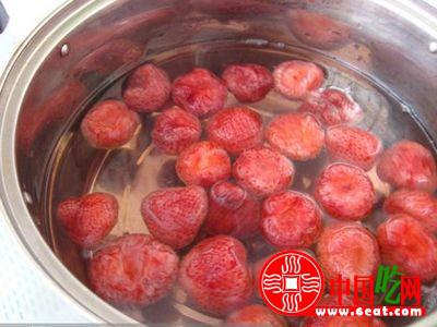 3、待冰糖溶化,糖水烧开,把冻草莓从水盆捞出放入糖水中;